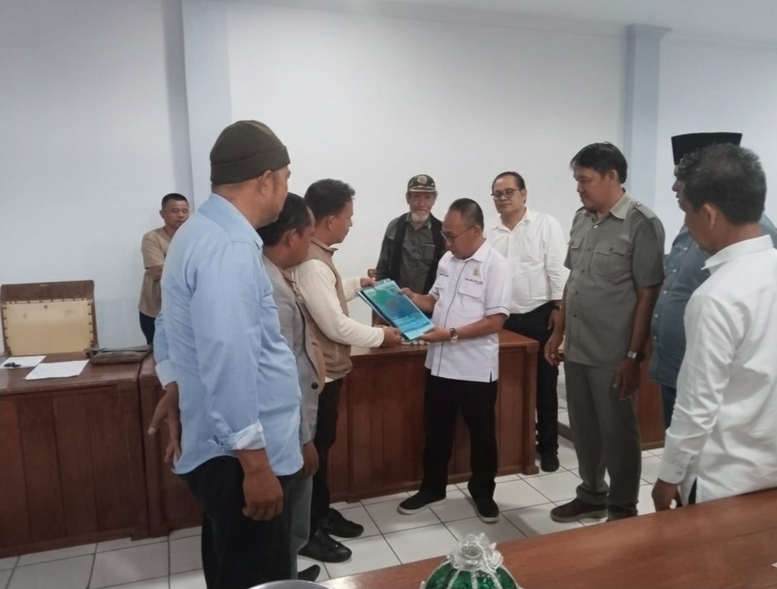 Ketua Komite Aksi Perjuangan DOB Tomatappa, Paharuddin, menyerhakan dokumen kepada Wakil Ketua DPRD Majene Abdul Wahab, SH disaksikan para peserta yang hadir dalam pertemuan tersebut. (Foto: Humas KAPP DOB Tomatappa)