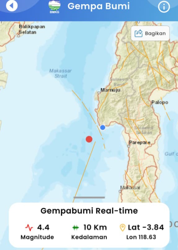 POLEWALI, MASALEMBO.ID — Gempa bumi bermagnitudo 4,2 mengguncang wilayah barat daya Kabupaten Polewali Mandar, Provinsi Sulawesi Barat, pada Kamis (17/10) pukul 17.32 WITA. Informasi resmi dari Badan Meteorologi, Klimatologi, dan Geofisika (BMKG) menyebutkan, episenter gempa berada di koordinat 3,86 Lintang Selatan dan 118,70 Bujur Timur, sekitar 75 kilometer barat daya Polewali Mandar, dengan kedalaman 10 kilometer di bawah permukaan laut.