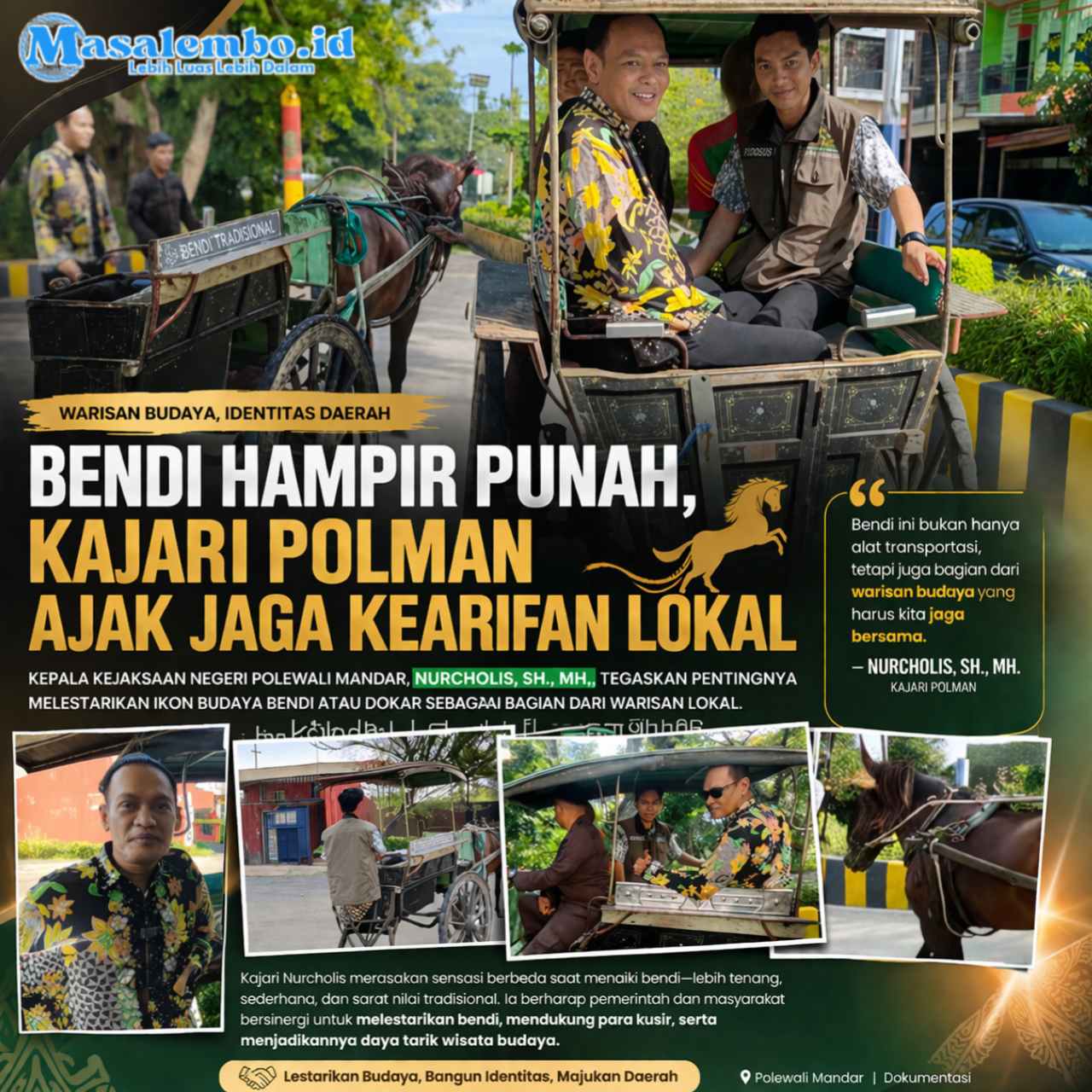POLMAN.MASALEMBO.ID — Kepala Kejaksaan Negeri Polewali Mandar, Nurcholis, SH MH mengajak masyarakat Polman untuk turut menjaga dan melestarikan kearifan lokal berupa transportasi tradisional bendi/Dokar yang kini keberadaannya semakin jarang ditemui.